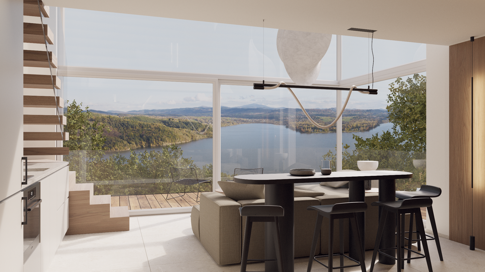 Zažijte jedinečný pocit luxusu v tomto výjimečném vrchním apartmánu s rozlehlou galerií a stropy sahajícími až do výšky 6 metrů. Dominantou prostoru je impozantní prosklená stěna, která nabízí ničím nerušený panoramatický výhled na jezero, a to hned z několika míst.