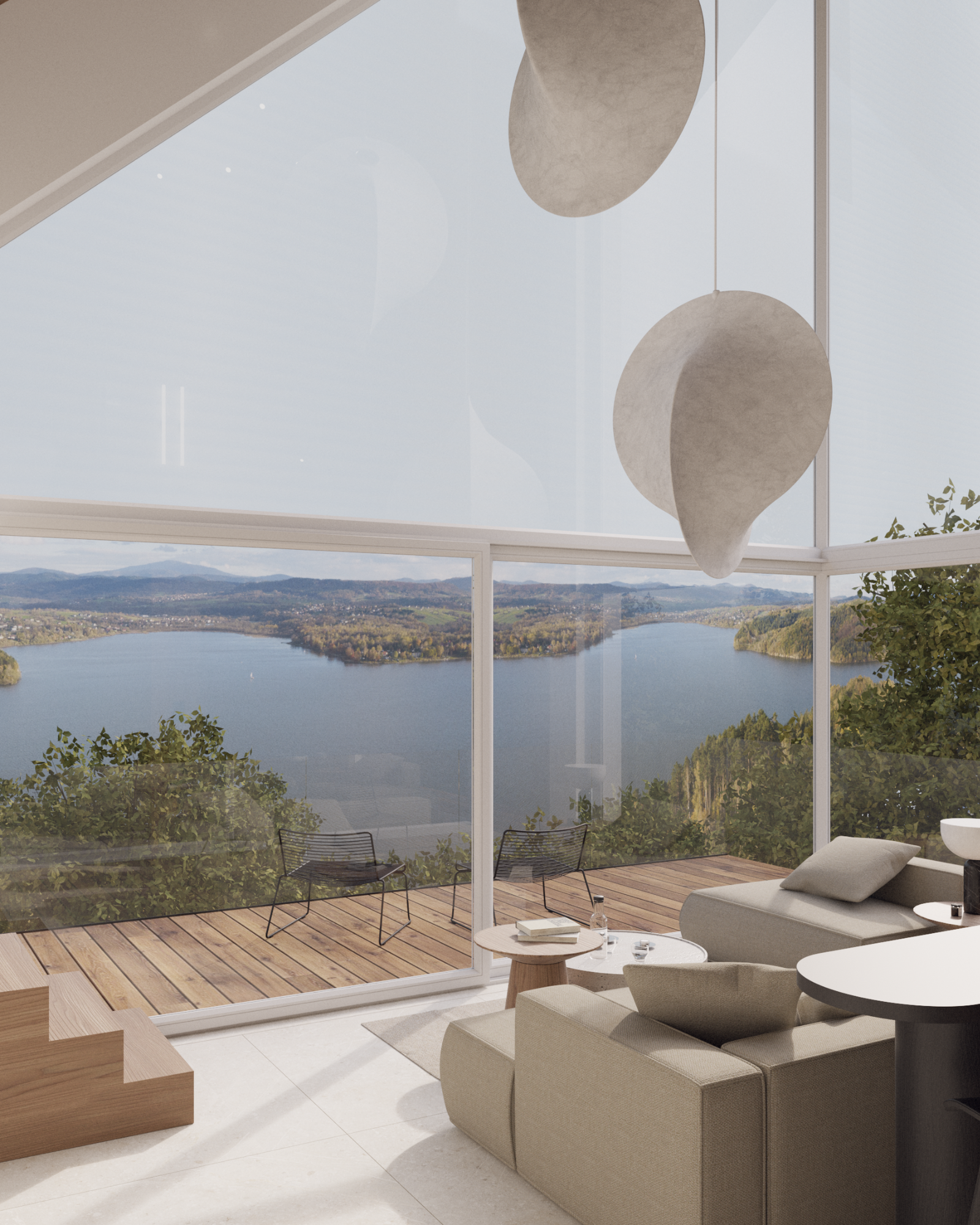 Zažijte jedinečný pocit luxusu v tomto výjimečném vrchním apartmánu s rozlehlou galerií a stropy sahajícími až do výšky 6 metrů. Dominantou prostoru je impozantní prosklená stěna, která nabízí ničím nerušený panoramatický výhled na jezero, a to hned z několika míst.
